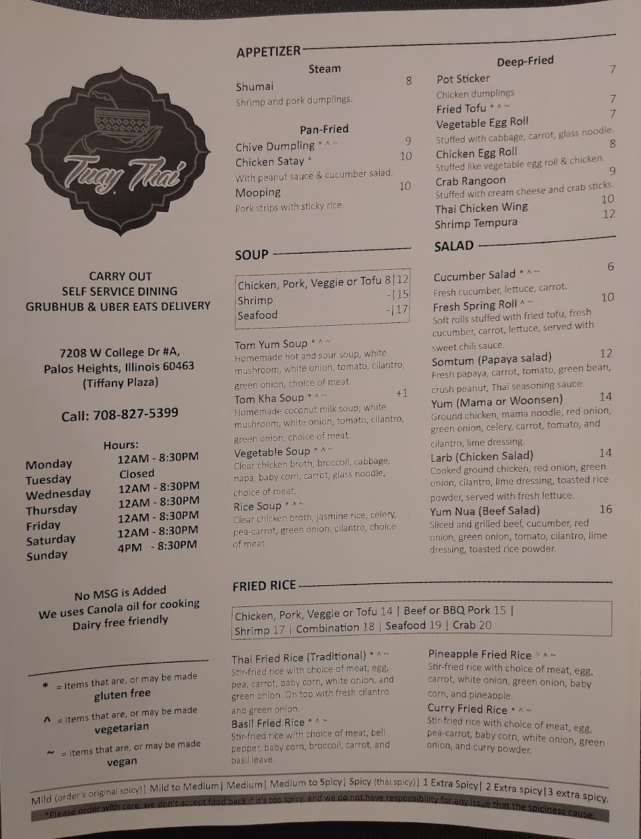 Welcome to Tuay Thai Restaurant, a culinary gem located in Palos Heights, Illinois, cherished by locals for its authentic flavors and welcoming atmosphere. With a menu tailored to satisfy diverse palates, Tuay Thai features an array of delightful dishes. Start with their delectable curries, such as the comforting Yellow Curry with your choice of protein, or indulge in the rich flavors of Massaman Curry. For noodle enthusiasts, the Pad Thai offers stir-fried rice noodles bursting with freshness, while the Lard Nar provides a savory twist that won’t disappoint. Don't miss the unique On Top With Sauce options, like the crispy Orange Chicken that delivers a satisfying crunch paired with sweetness.